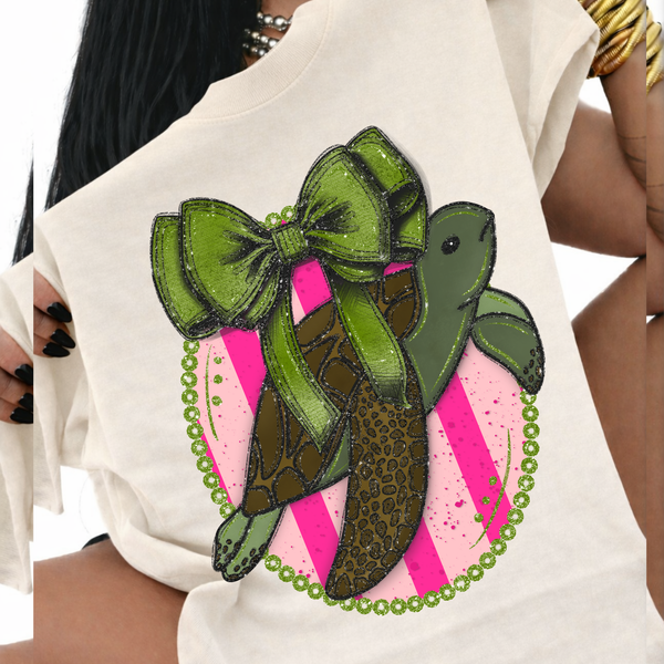 Sea Turtle Glitter Bow & Stripes Oval Coquette Digital Design, PNG